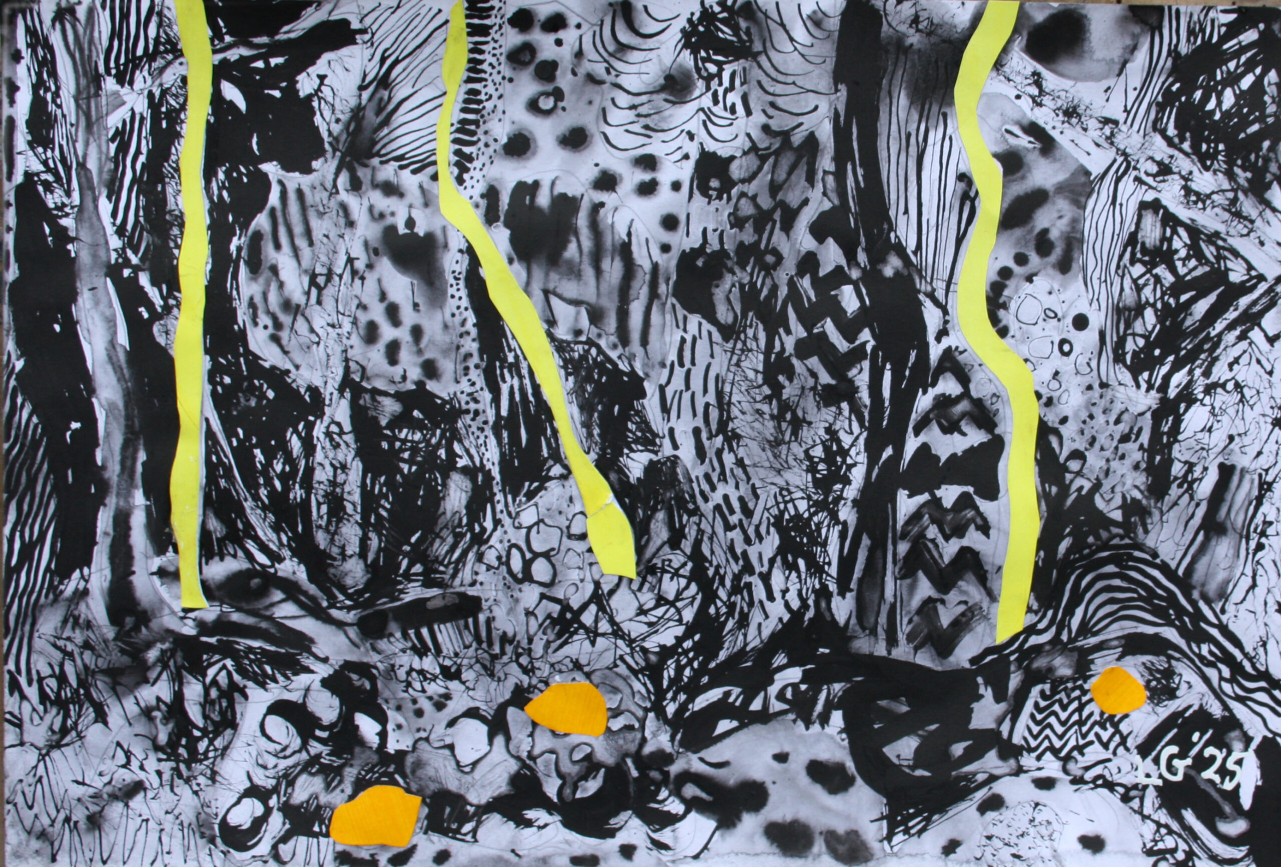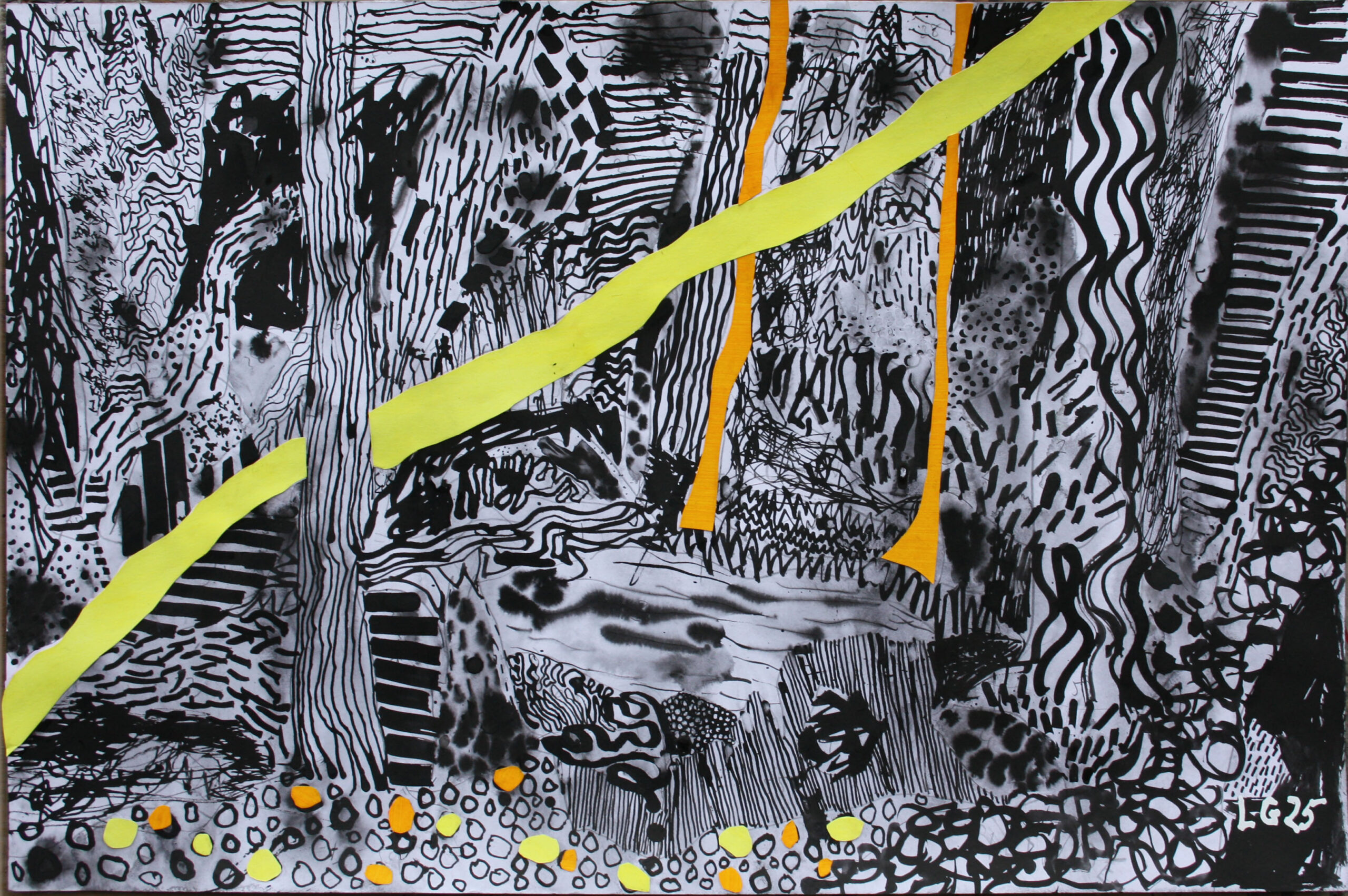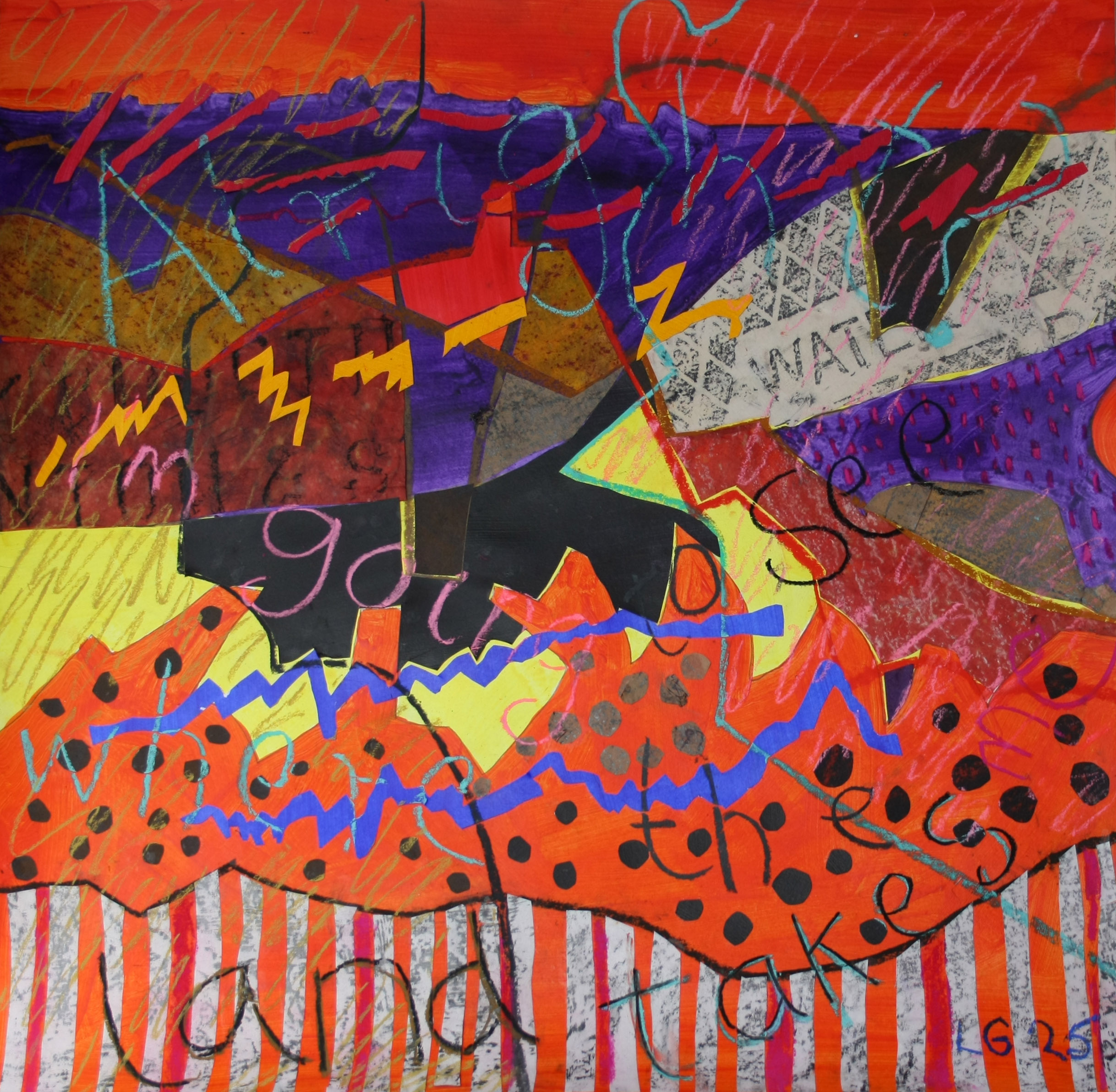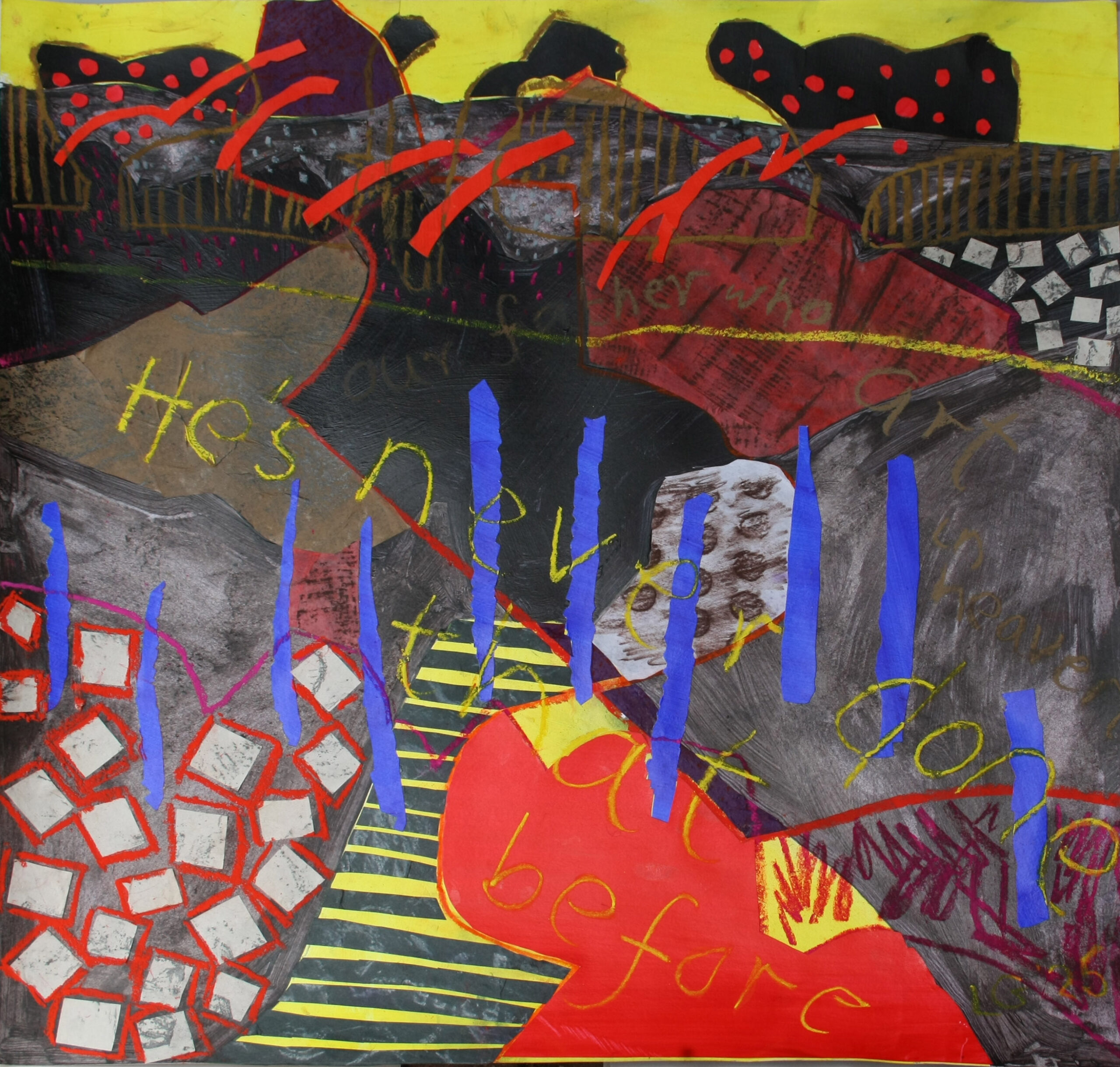 The Blackdown Hills are Liz’s home and she has been drawing and responding to them for 45 years. Influenced originally by impressionism, Liz would attempt to capture the light and shapes in front of her but as time progressed, she has become increasingly interested in what it feels and looks like to walk through the landscape: viewpoints changing constantly, the noises she hears, even the thoughts she has. Liz enjoys teaching, and through devising ways for her students to get excited by art, has experimented with techniques which have influenced the way she makes her own work. For example, simplifying complicated objects to bold shapes, reducing tones to just three and using the element of chance. None of this is new thinking, but it has helped Liz to keep being interested and surprised by what she produces.